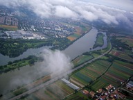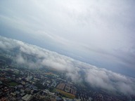 Flug über den Winzerer Höhen mit einer Schicht tiefhängender Wolkenfetzen.